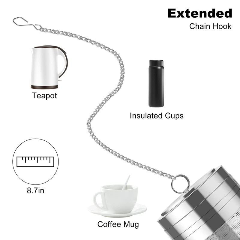 - Extended Chain: 8.7-inch extended chain with hooks, suitable for various sizes of teapots and insulated cups. Additionally, free tea spoons and drip tray are provided for easy retrieval of various loose teas.