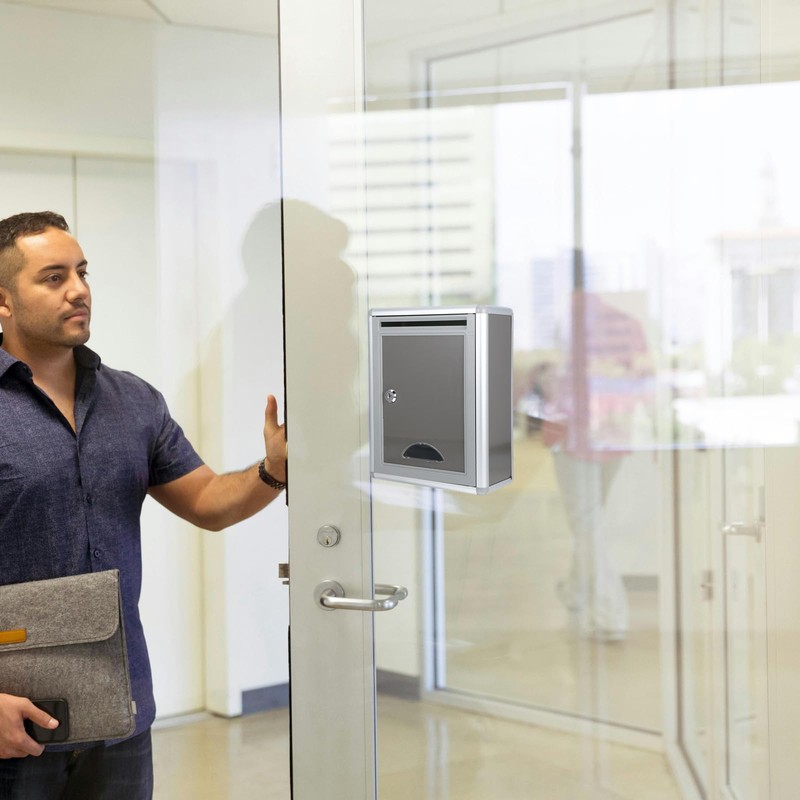 • Lockable Mail Box: This wall-mounted suggestion box is wide enough to accommodate bigger items than your average drop box slot. The innovative bin door featured here is designed to accept keys, payments, small parcels, letters and checks