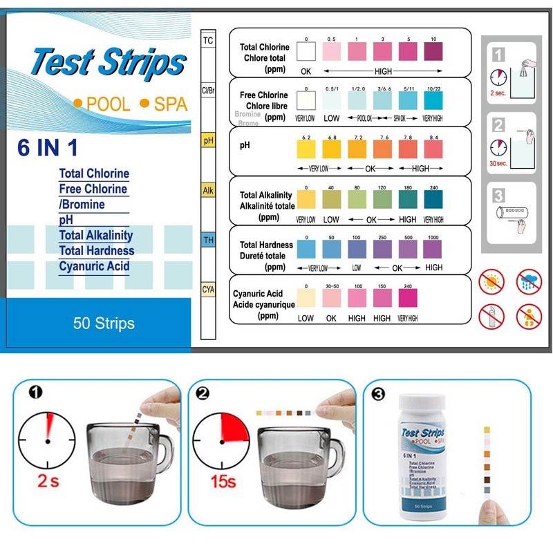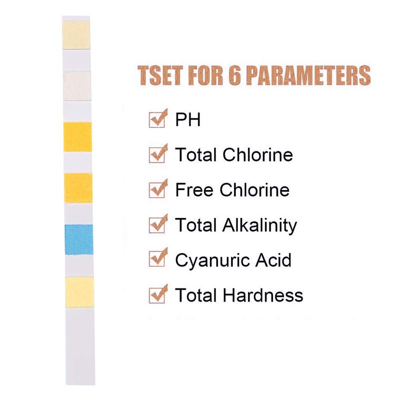 - 6 IN 1test strips :Test for 6 parameters: PH, Total Chlorine, Free Chlorine, Total Alkalinity, Cyanuric Acid, Total Hardness at the same time
