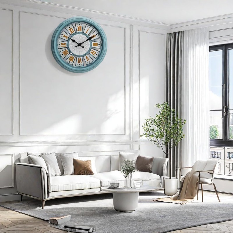 - Living Room Clock Classic appearance, 14 inches, with a simple blue frame and clear reading of large Roman numerals. Hollow design, a great decoration for homes and offices, is the best gift for family or friends and is also suitable for the elderly or people with poor eyesight