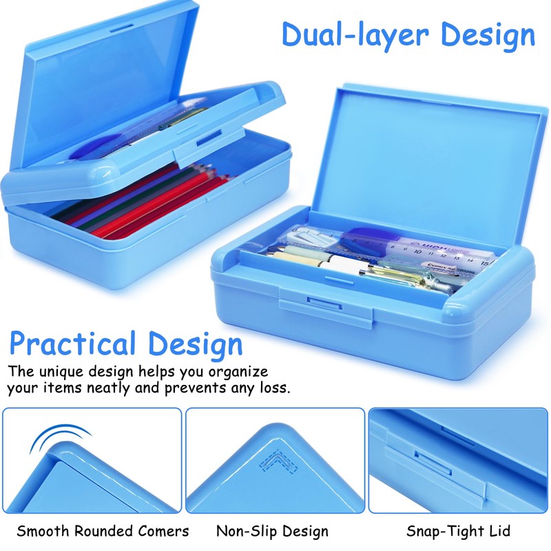 - 【Double-Layer Design】Our sturdy pencil case features a double-layer design, making storage simpler and more organized. The two-tier design allows you to easily and efficiently arrange and access your stationery items. The depth of the first layer is 0.7 inches, providing storage space for various small items. The second layer, with a depth of 1.6 inches, offers ample space for pencils, pens, erasers, crayons, and more.