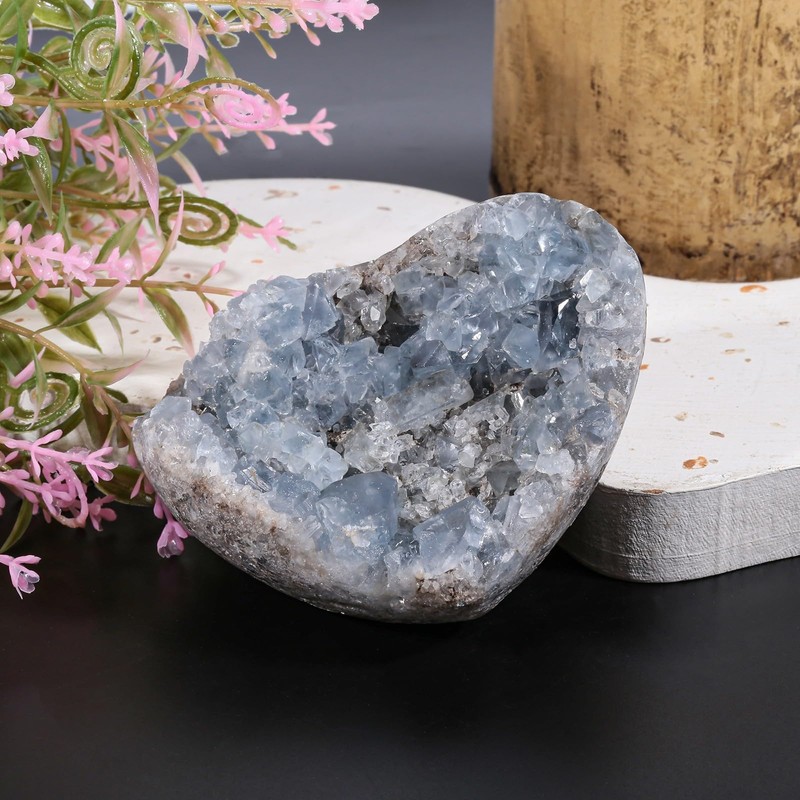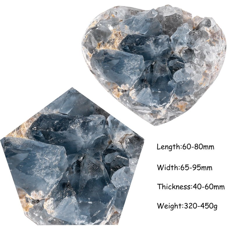 - 1 piece; material: celestite crystal; size: 60x65x40mm-80x95x60mm (L x W x D), weight: 320-450g; delivery: 1x Celestite crystal druse, 1x pink gift bag