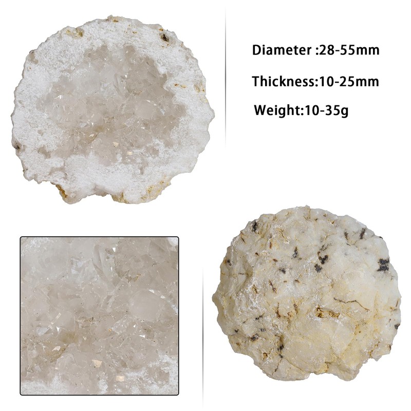 - Set of 2 Dimensions(approx) - 28-55mm(1.1"-2.16") in diameter, 10-25mm(0.4"-1") in thickness; Weight: 10-35g/pc. Comes with a branded gift bag and a gift box, convenient for preservation or gift giving. Since each stone specimen is a unique natural crystals, please expect some slight variation in terms of size, colour, texture and shape, etc.
