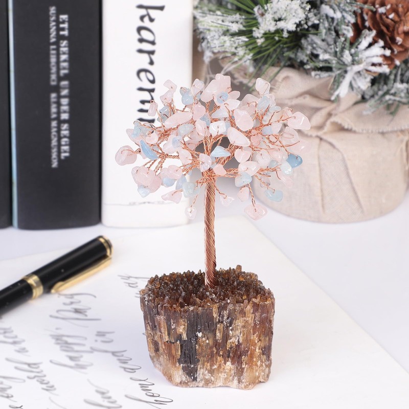 Nupuyai Rough Amber Calcite Base with Crystal Tree Handmade Wire Wrapped Tree of Life Feng Shui Money Tree Decor for Window Tabletop, Rose Quartz/Aquamarine