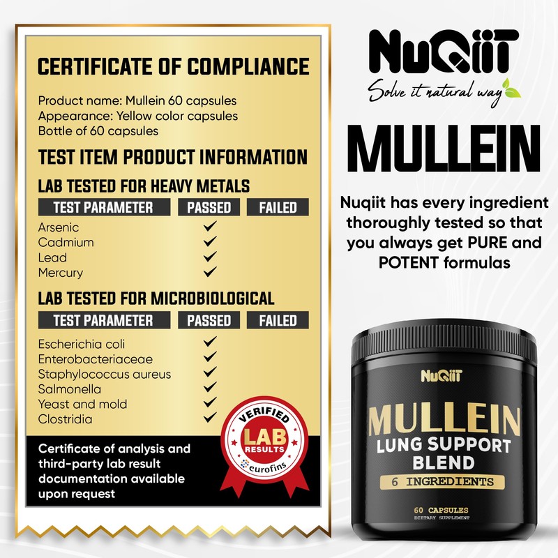 - Enjoy The Heritages From Nature: NUQIIT high-quality extracted Mullein Complex comes from ingredients Mullien Leaf extract, Blend Extract: Cordyceps Sinensis, Bromelain, Marshmallow, Olive Leaf, and Pine Bark; providing better absorption.