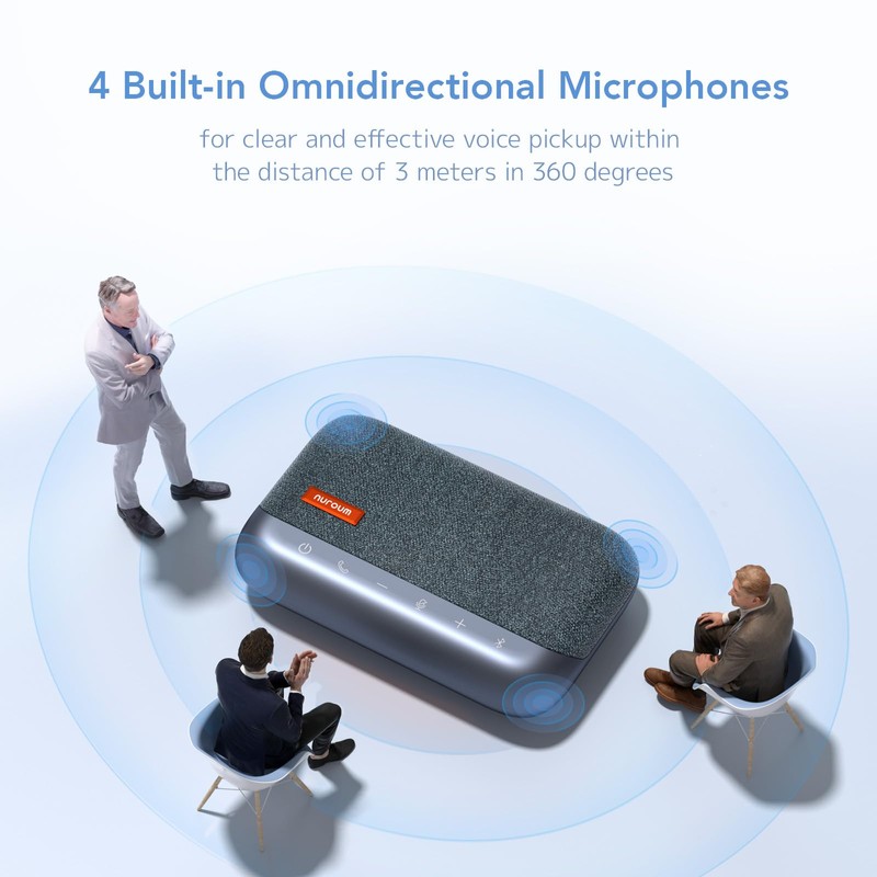 - 360° Omnidirectional Mic & Daisy Chain: Nuroum A15 conference speaker and microphone is built with 4 professional-level microphones that capture clearly all voices at a 360-degree angle. The conversations are picked up with a strong sound and natural bass. In addition to individual home office, the speaker mic is ideal for corporate meeting rooms with up to 10 people. By cascading 2 A15 units, conferences with even 20 participants can be supported.