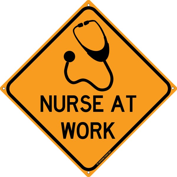 Nurse At Work sign: Measures approximately 12" x 12"; ships new in manufacturers packaging; comes with pre drilled holes in each corner for easy hanging.