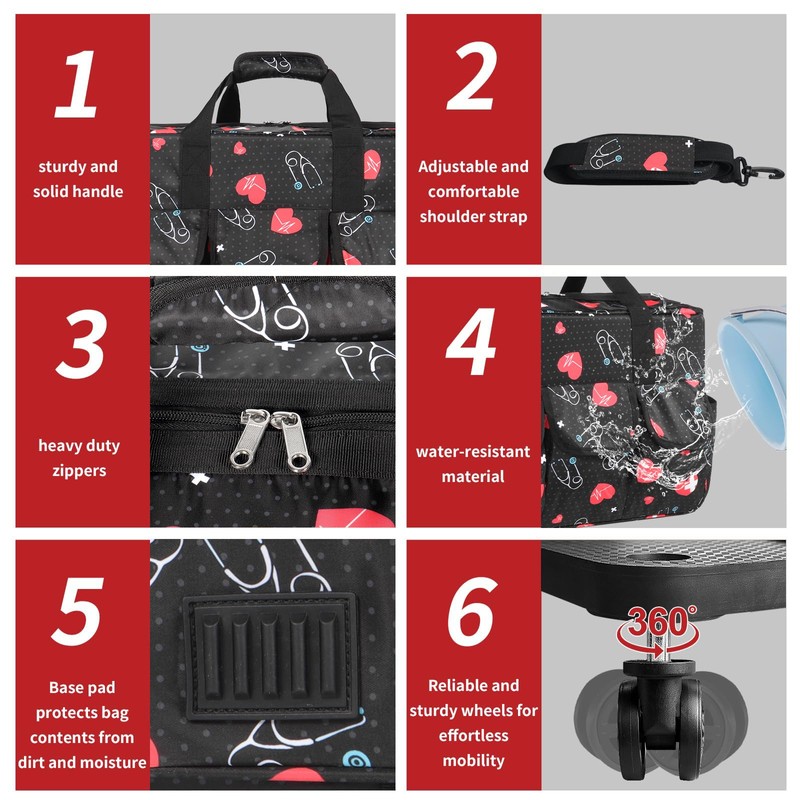 - Ample Storage Capacity: The NURSE Rolling Medical Bag features a spacious main compartment and multiple internal and external pockets, providing ample space to store various medical supplies, instruments, and documents. Say goodbye to clutter and stay organized and efficient during your work.