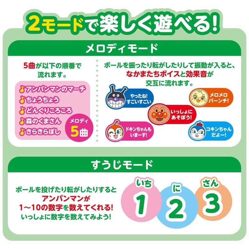 • Includes 5 melody songs including Anpanman March, and a full line of Anpanman and Baikin-man
