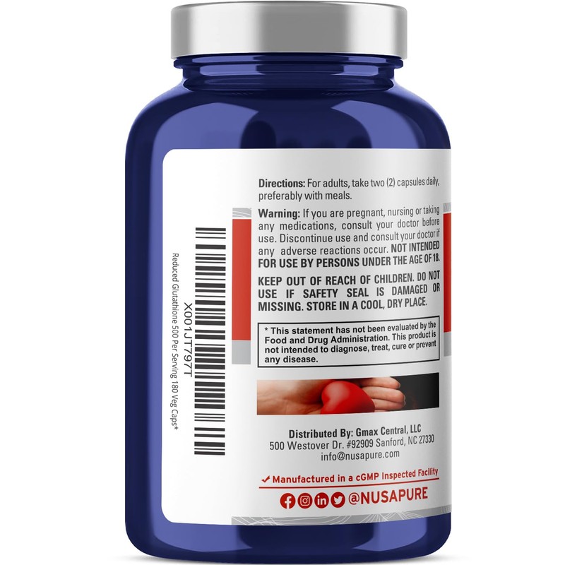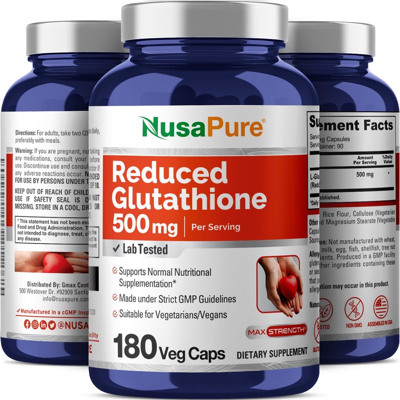 NusaPure NusaPure Reduced Glutathione 500mg 180 Veggie Capsules (Vegan,Non-GMO) L-Glutathione