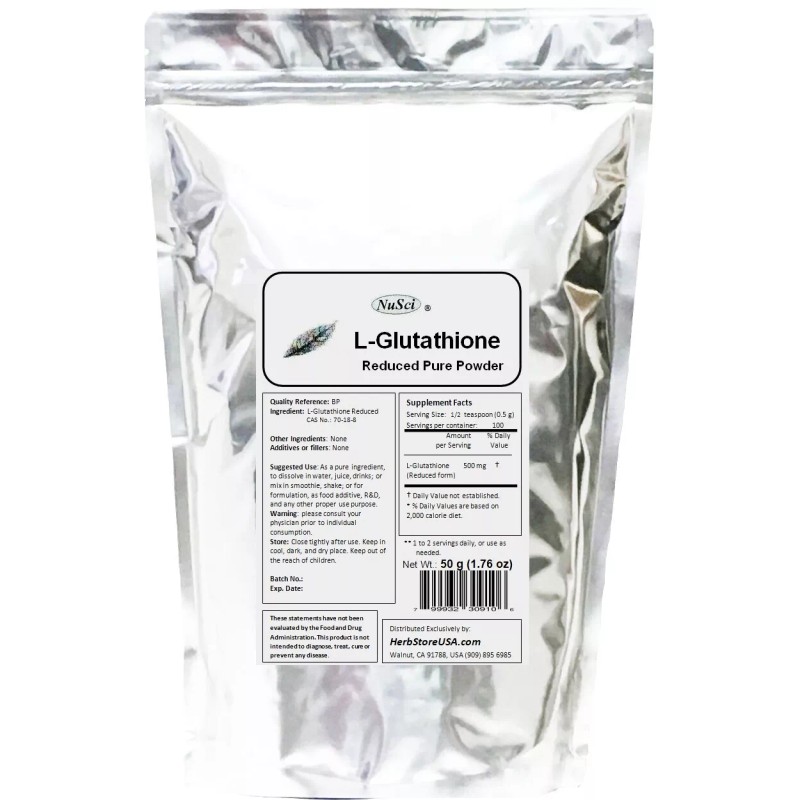 50 grams (1.76 oz) L-Glutathione (Reduced form) pure powder which conforms to British Pharmacopeia (BP) quality standard. There is not any additive or filler inside. Assay >99% content. It is fresh enough for use. There is 1~1.5 years shelf life available