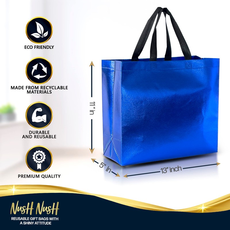 Nush Nush Set of 60 Shiny Large Blue Gift Bags in Bulk - Blue Reusable Gift Bags With Handles - For Small Business As Goodie Bags, Birthday Gift Bags, Party Favor Bags, Goody Bags- 13Wx5Dx11H Size