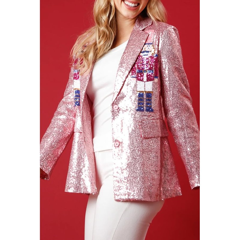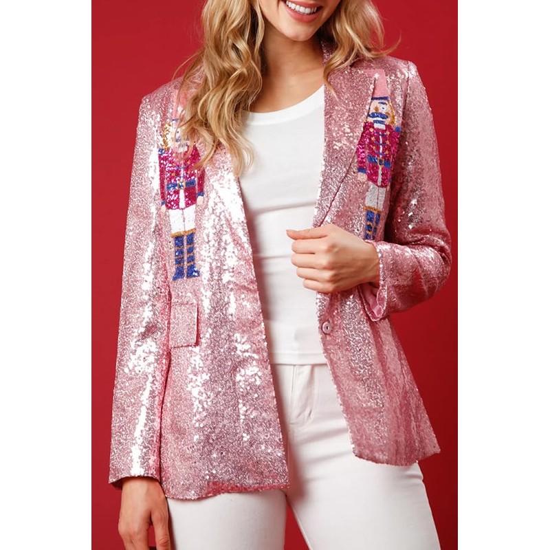 - Match: Pink sequin nutcracker blazer,women fashion casual sequin blazer easy to match with camisole, tank tops, blouse, shirts, shorts, casually over jeans, formally with dressy slacks, dress and prom gowns. Paired with your fabulous necklace, statement earings and high heels.