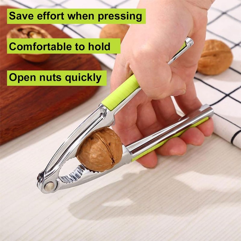 - ERGONOMIC DESIGN This nutcracker handle adopts a non-slip design, which can prevent slipping during use and ensure a firm grip. The green handle protection layer ensures that our hands are not hurt when squeezing the walnuts.