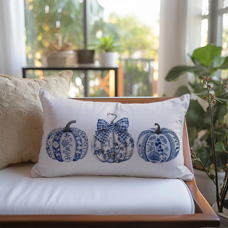 - Elegant Autumn Decor: This chic pillow cover showcases a charming trio of blue-and-white patterned pumpkins, creating a sophisticated autumnal aesthetic.
