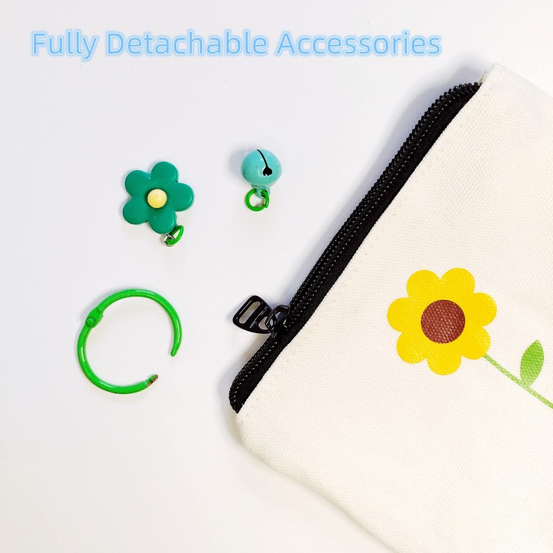 • 🌻 Fully detatchable decorative accessories, including a ring, a bell and a little flower. You can choose your own combination, add your own keys or accessories, or remove them completely from the zipper. Colours may vary, please refer to the main picture..