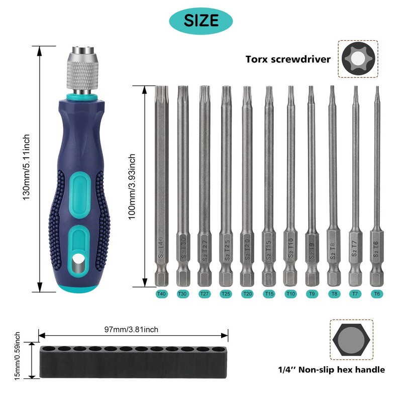 - Magnetic drill: 13 pieces Torx screwdriver set, with hole S2 electric screwdriver bit set, Torx drill set includes: T6, T7, T8, T9, T10, T15, T20, T25, T27, T30, T40. All drill bits have a magnetic head that accurately blocks each edge, fixing screws easily and firmly, improving your work efficiency