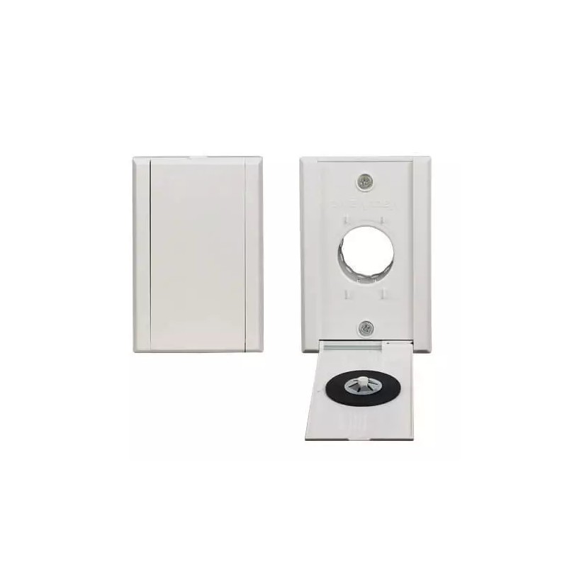 This inlet requires a standard mounting bracket (sold separately) for new installations. It can also be used to replace the face of old universal style standard inlets for a new fresh look. The full door closure covers the screws, door springs, and hose stops on the body of the valve. The screws for mounting are include. The door is hinged and has a rubber gasket that seals off the inlet to prevent air leak when closed.