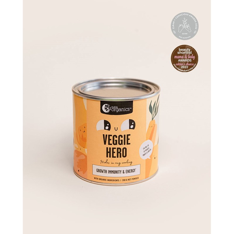 A heroic blend of 15 veggies, fruits and super greens designed for kids’ taste buds and parents’ peace of mind that easily hides in all sorts of cooking. No more nagging, pleading and bribing for the broccoli to go down, Veggie Hero is here to save the day from fussy eating moments and meal time veggie standoffs!
