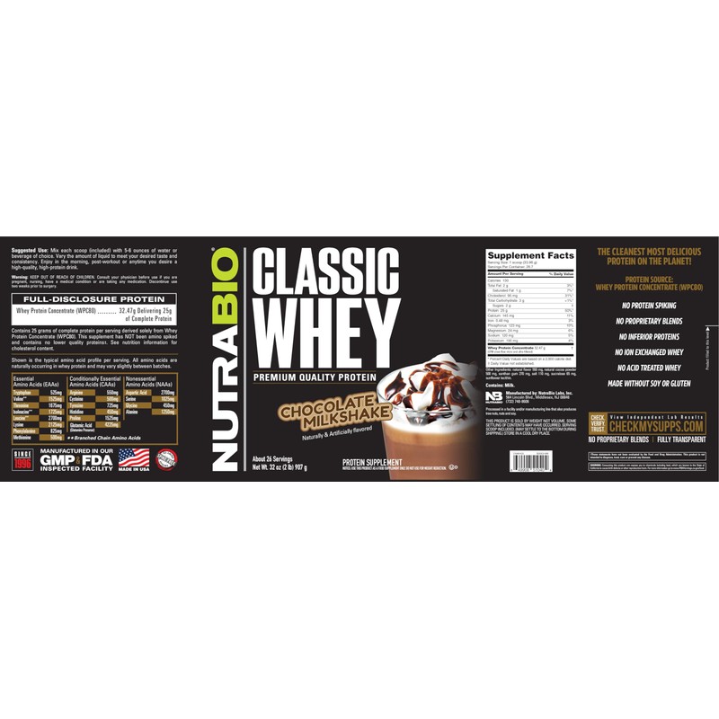 - Full Label Disclosure and Transparency: NutraBio Classic Whey offers full label disclosure and no proprietary blends, ensuring you know precisely what you're getting. This supplement powder delivers 25 grams of pure protein sourced solely from WPC80 whey concentrate. Every batch of every product is tested by independent third-party labs for quality assurance