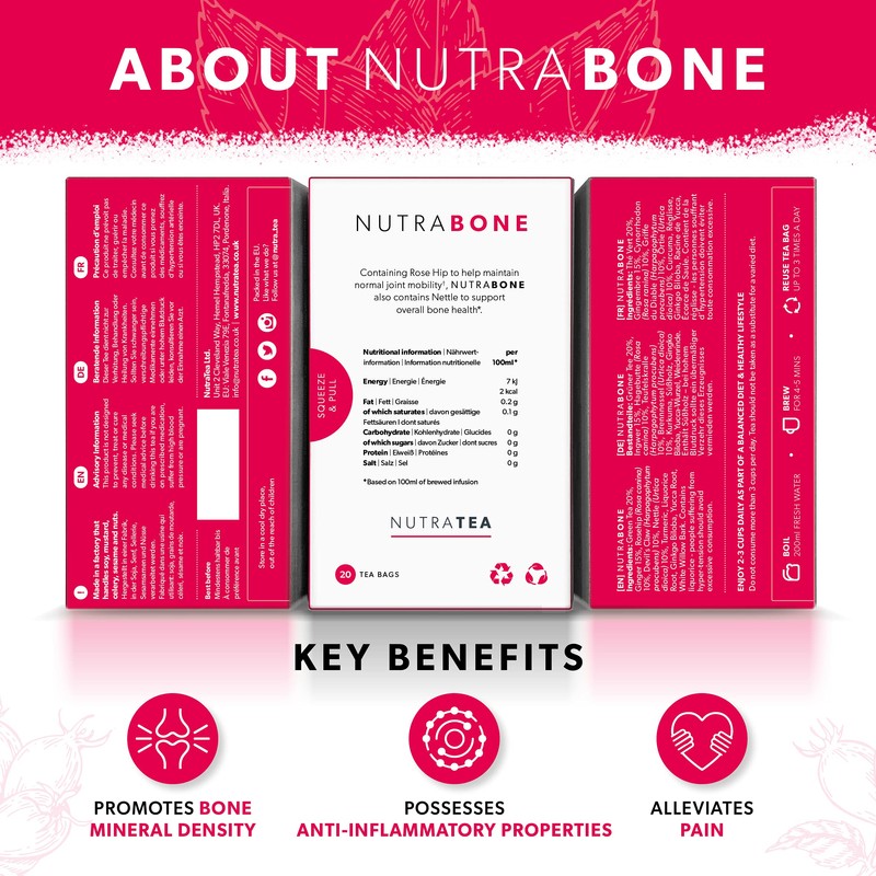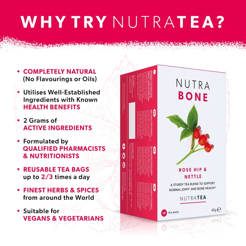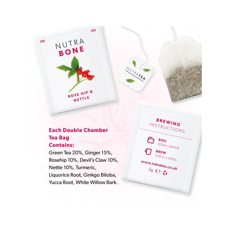NUTRABONE - Bone Health Tea – Includes Rose Hip, Ginkgo Biloba and Yucca - For Bone Strength and Support - 20 Enveloped Tea Bags - by Nutra Tea - Herbal Tea