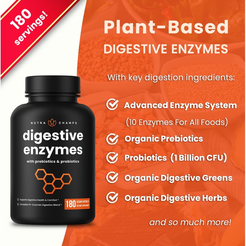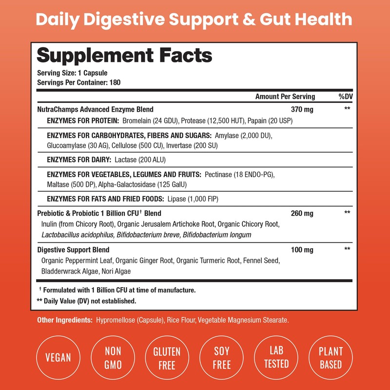NutraChamps NutraChamps Digestive Enzymes with Probiotics and Prebiotics for Women & Men - 180 Vegan Capsules with Bromelain for Bloating & Optimal Gut Health