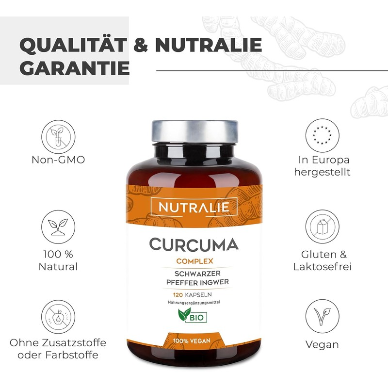 Nutralie Organic turmeric, 100% natural, optimal combination of turmeric and black pepper, 120 vegan capsules with high absorption of turmeric, ginger and piperine, turmeric complex