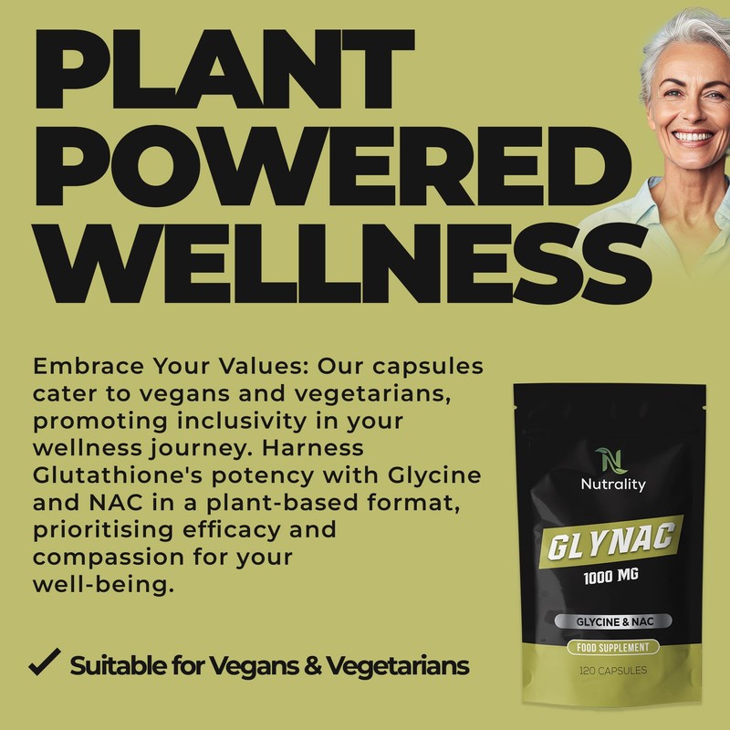 - PLANT-POWERED WELLNESS: Embrace a Supplement Aligned with Your Values: Our capsules are carefully crafted to align with vegan and vegetarian preferences, guaranteeing inclusivity in this journey towards wellness. By harnessing the potent capabilities of Glutathione through Glycine and NAC in a plant-based format, you're opting for a path to well-being that prioritises both efficacy and compassion.