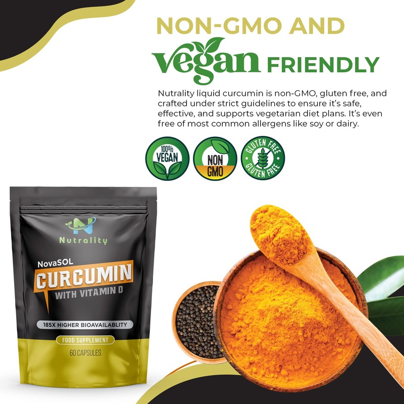 - NON-GMO AND VEGETARIAN FRIENDLY: Nutrality liquid curcumin is non-GMO and gluten free and crafted under strict guidelines to ensure it’s safe, effective and supports vegetarian diet plans. It’s even free of most common allergens like soy or dairy.