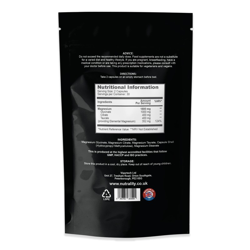 Nutrality Magnesium 3-in-1 Complex Food Supplement | 1800mg High Absorption Glycinate, Citrate and Taurate | 352mg Elemental Magnesium | Muscle, Sleep & Nerve Support | Made in UK | 60 Vegan Capsules