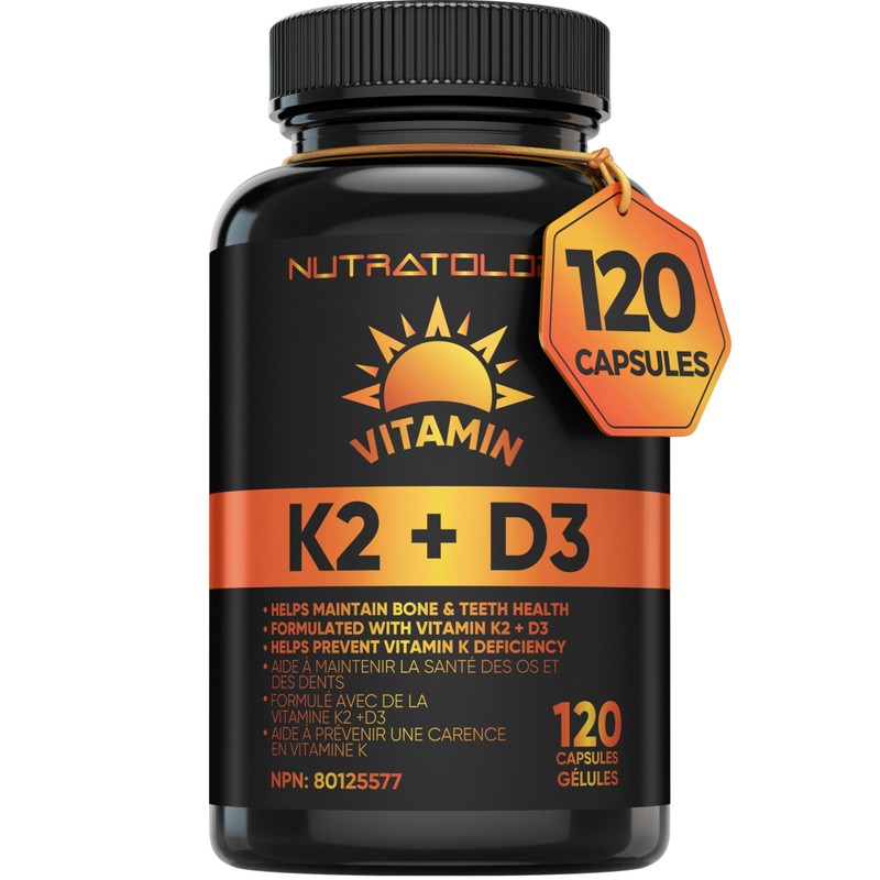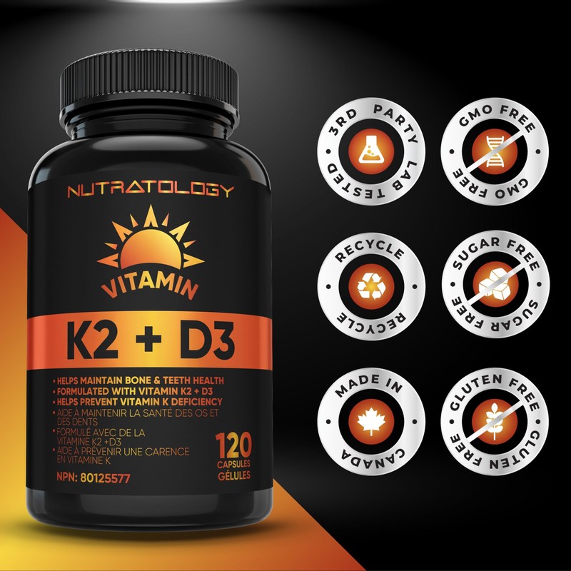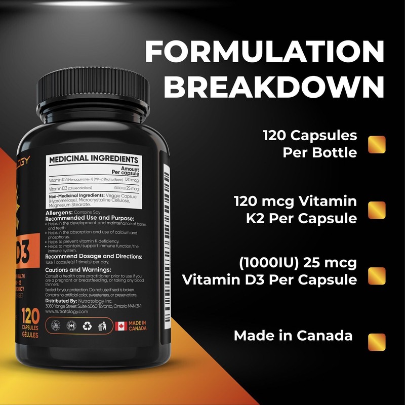 Nutratology Nutratology Vitamin K2 + D3 Highest Potency 120MCG/1000 IU - 120 Capsules - Helps Maintain Bone & Teeth Health - Formulated With MK-7 For Best Results - Immune System Support - Made In Canada