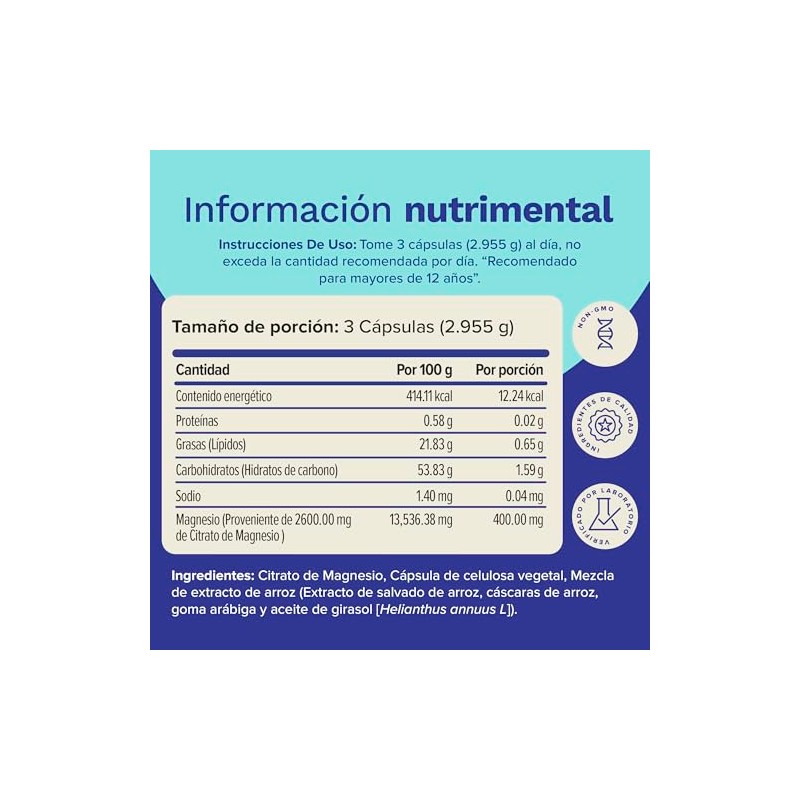Acerca de este artículo Energía Natural - Nuestra fórmula avanzada proporciona 400 mg de magnesio puro por cápsula, el valor diario recomendado para respaldar más de 300 reacciones enzimáticas esenciales en su cuerpo, respaldando el bienestar general. Alta Absorción - Aproveche al máximo cada dosis con los beneficios adicionales del extracto de salvado de arroz y el aceite de girasol para maximizar la absorción y la eficacia. Bienestar en Todo el Cuerpo – Cumpla con sus necesidades diarias de magnesio de una manera sencilla y eficaz con 3 cápsulas vegetales fáciles de tragar para ayudar a mantener el equilibrio y respaldar un estilo de vida saludable. Transparencia de Etiqueta Limpia - Nuestros suplementos contienen solo ingredientes puros, no modificados genéticamente (sin OGM), lo que brinda una forma limpia y saludable de alcanzar objetivos nutricionales sin rellenos ni aditivos innecesarios.