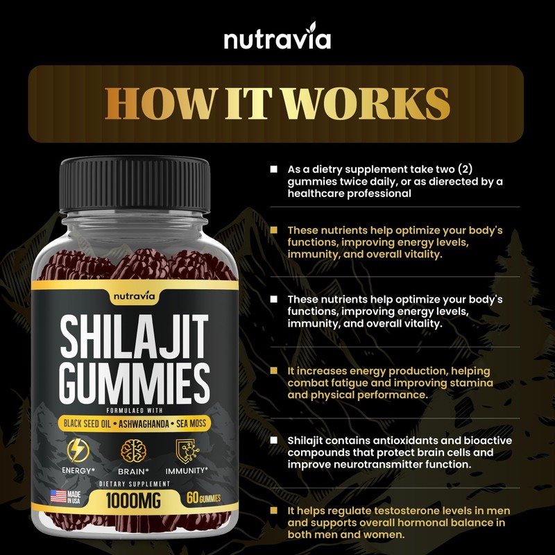 - High-Quality & Pure Formula C Carefully sourced Shilajit, combined with premium ingredients, ensures a great-tasting gummy without artificial fillersjust clean, effective nutrition.