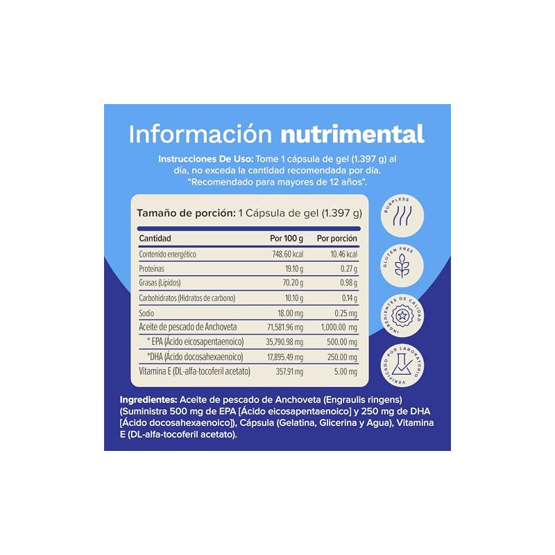 - Obtenga una fuente natural de ácidos grasos Omega 3 con solo una pequeña cápsula diaria que proporciona 1000 mg de aceite de pescado, 500 mg de EPA y 250 mg de DHA de Anchoveta, conocidas por su bajo riesgo de bioacumulación de contaminantes. Alta absorción