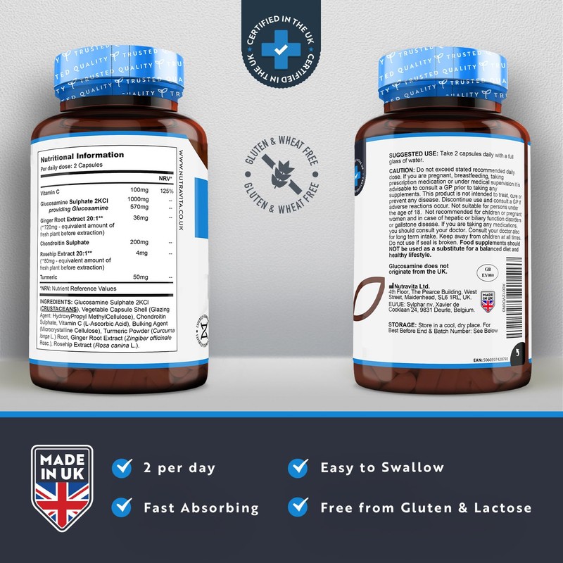 - WHY NUTRAVITA'S GLUCOSAMINE & CHONDROITIN COMPLEX SUPPLEMENT? - Our supplement contains 1000mg of Glucosamine Sulphate & 200mg of Chondroitin Sulphate per serving. Furthermore, our supplement has been blended with Vitamin C, Turmeric, Ginger Root & Rosehip for added benefits.