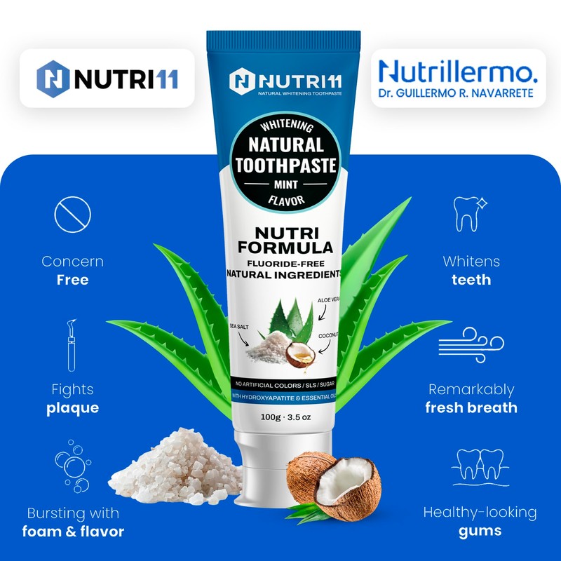 Product Description (SEO Enhanced Content): NATURAL WHITENING TOOTHPASTE – GENTLE, FLUORIDE-FREE ORAL CARE Upgrade your oral care routine with the NUTRI11 Natural Whitening Toothpaste, a gentle yet effective solution designed to brighten teeth, strengthen enamel, and promote gum health without the use of harsh chemicals. Perfect for individuals with sensitive teeth, this toothpaste is crafted with a clean, natural formula powered by hydroxyapatite and baking soda to gently whiten teeth while remineralizing enamel. Key Benefits: ✅ Natural Whitening Power: Gently removes stains caused by food, drinks, and daily habits, leaving teeth noticeably whiter with each use. ✅ Fluoride-Free Protection: Formulated with hydroxyapatite, a natural enamel-strengthening ingredient, ideal for cavity prevention and enamel remineralization. ✅ SLS-Free for Sensitive Teeth: Gentle enough for those with sensitivity, ensuring a soothing brushing experience without irritation or discomfort. ✅ Essential Oils for Gum Health: Infused with peppermint oil and rosemary extract to promote healthy gums and provide long-lasting freshness. ✅ Safe & Clean Ingredients: Free from artificial colors, sugar, and harsh chemicals, making it a perfect choice for health-conscious individuals and families. How to Use: Apply a pea-sized amount to your toothbrush. Brush thoroughly for 2 minutes to cover all teeth and gums. Rinse well and enjoy a fresher, healthier smile. Why Choose NUTRI11 Natural Whitening Toothpaste? Created by Dr. Guillermo Rodriguez Navarrete, NUTRI11 offers a scientifically backed, natural solution for superior oral care. Whether you’re looking for a fluoride-free alternative, a gentle option for sensitive teeth, or a clean, natural formula, this toothpaste delivers whitening and protection you can trust. Features at a Glance: Whitening Power: Gently brightens teeth naturally Remineralization: Hydroxyapatite strengthens enamel Fluoride-Free: Safe, natural cavity protection SLS-Free: Prevents gum irritation and sensitivity Mint Freshness: Leaves your mouth clean and refreshed Image Slogans for Infographics or Ads: “Brighten Your Smile Naturally – No Harsh Chemicals.” “Fluoride-Free Protection. Enamel-Safe Whitening.” “Sensitive Teeth? We’ve Got You Covered.” “Gentle Whitening. Fresh Mint Flavor.” “Clean Ingredients for a Healthier Smile.” Backend Keywords (High SV Focus): natural toothpaste, fluoride-free toothpaste, sensitive teeth toothpaste, enamel strengthening toothpaste, whitening toothpaste, baking soda toothpaste, SLS-free toothpaste, mint toothpaste, cavity protection toothpaste, natural teeth whitening toothpaste