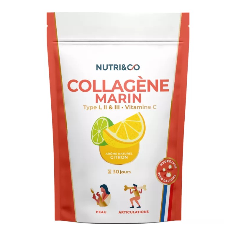 Nutri&Co Marine Collagen is an exceptional dietary supplement designed to improve both the quality of your skin and the health of your joints. This product is distinguished by its patented hydrolyzed collagen peptides, renowned for their high assimilation thanks to their small molecular size of 2,000 Daltons. This characteristic ensures rapid, effective absorption by the body, guaranteeing visible, long-lasting results.