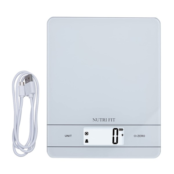 nutri fit Digital kitchen scales with USB rechargeable, portable graduation 0 1 oz / 1 g. Stylish colourful pattern design the scale with different types of colourful design patterns to make your kitchen more fashionable and comfortable, it is not only tools, but also a good decoration for your kitchen. Movable design with 3 mm tempered glass design, total weight is 0. 88 lb, the food scale becomes lighter and portability. Multi-function: the Nutri Fit digital kitchen scale delivers low battery and overload indicator; zero/tare function; 3 minutes auto shut-off function. Specification: Capacity: 0. 1 ounce / 1 g 11 lb / 5000 g. Department: 0. 1 ounce / 1 g unit: g / fl. ounce. / lb (oz.) / ml dimensions of the scale: 8. 36. 30. 7 in / 21016019 mm. Net weight: 0. 88 lb LCD size: 2. 31. 1 inch / 5827 mm battery: 3. 7 V / 2500 mAh. Package includes: 1 x digital kitchen scale. 1 x user manual (English language not guaranteed). 1 x dough scraper. 1 x USB cable