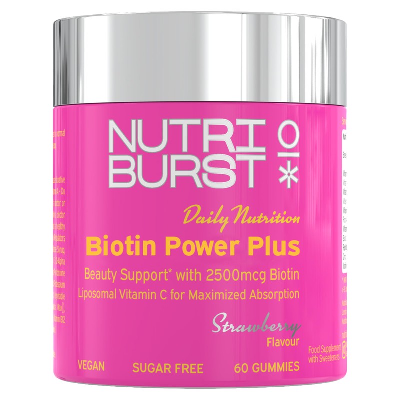 Nutriburst Biotin Power Plus - Biotin (2500mcg) + Liposomal Vitamin C for Healthy Hair & Glowing Skin - Strawberry Flavour - 60 Gummies 1 Month Supply - Suitable for Vegans