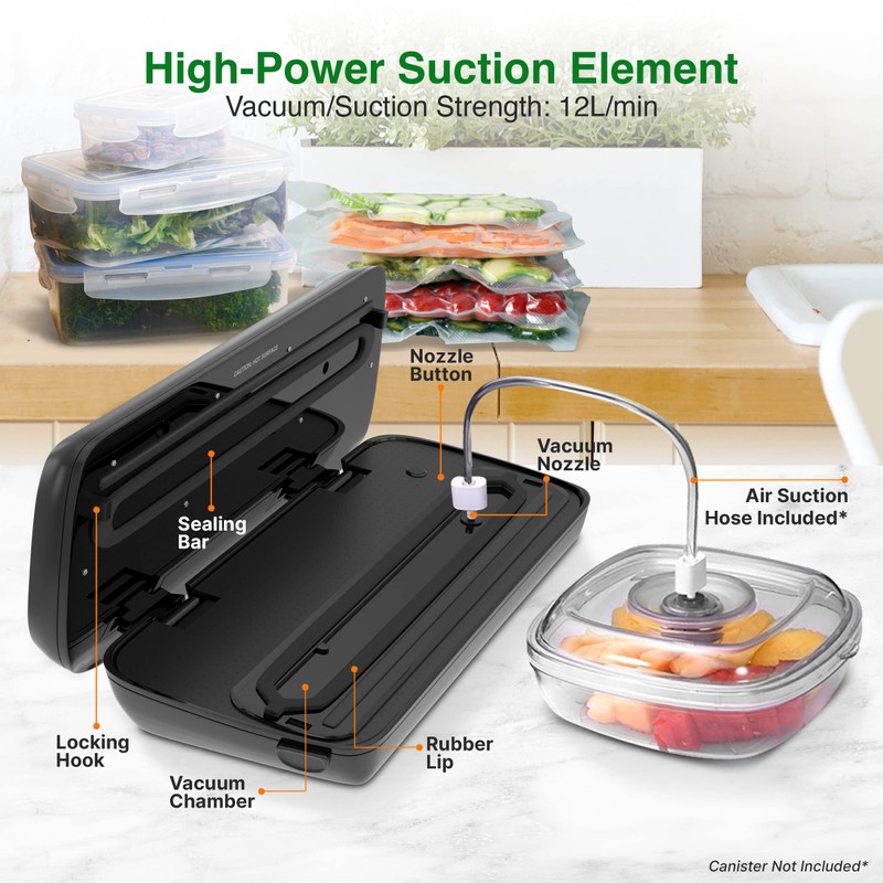 * High-Power Suction Element: 110 Watt * Vacuum/Suction Strength: 12L/min * Sealable Bags: Environment Friendly Polyamide * Withstands Food Temperature of 212 ℉ Max. * Construction Material: Engineered ABS * Power Cord Length: 3.3’ ft. * Power: 120V * Dimensions (L x W x H): 14.1’’ x 6.0’’ x 3.0’’ * Sold as: 1 * Weight: 2.93 lbs.