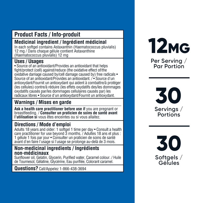 - Nutricost 12mg Astaxanthin contains 30 softgels in each bottle for a total of 30 servings.
