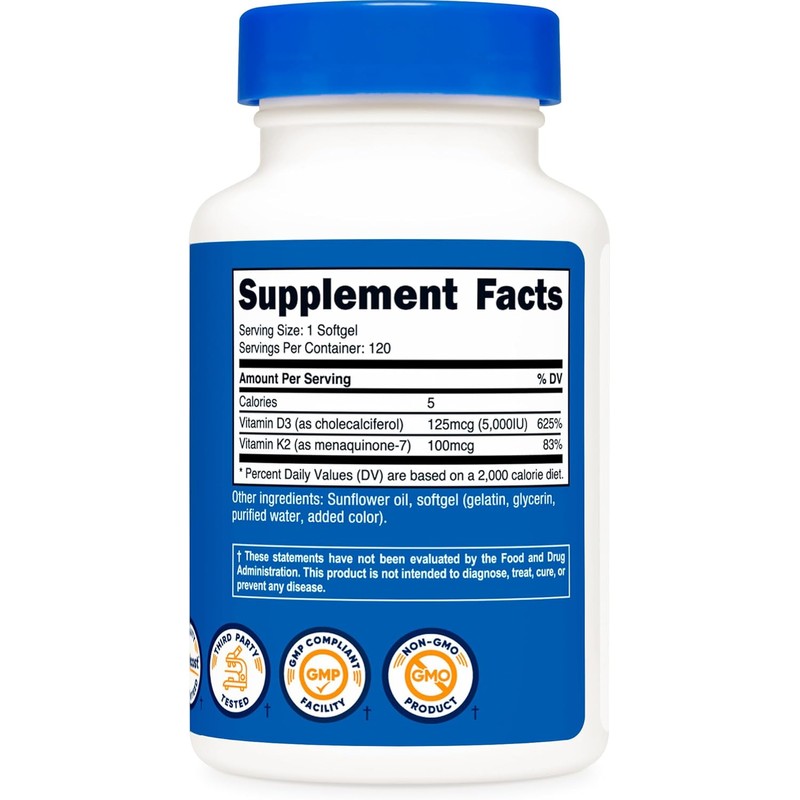 This bottle provides 120 servings of Vitamin K2 + D3, delivering 100 mcg of Vitamin K2 (MK7) and 5000 IU of Vitamin D3 per serving. This combination works synergistically to support calcium absorption and bone health. Vitamin D3 helps the body absorb calcium, while Vitamin K2 ensures calcium is directed to the bones and not the arteries or joints. The formula is non-GMO, gluten-free, and manufactured in a GMP-compliant, FDA-registered facility, ensuring high standards of quality and safety.