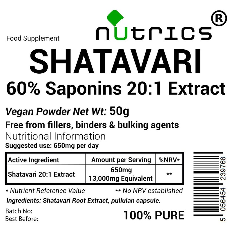 Nutrics 60% Saponins 13,000mg (per capsule) SHATAVARI Extract V Capsules - Asparagus Racemosus SHATAVARI ROOT EXTRACT 13,000mg (per capsule) 60% Saponins Standardised 20:1 Extract Ratio - 20 times stronger than shatavari powder 650mg Pure Extract – 13,000mg Equivalent (per capsule) Strong & Effective Safe Dose No Additives Free from binders, fillers and bulking agents Suitable for Vegan, Vegetarian, Halal, Kosher, Plant Based Diet