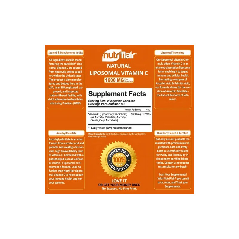 La Vitamina C 1700Mg liposomal de NutriFlair es una mezcla de formulación avanzada con ingredientes de la más alta calidad.