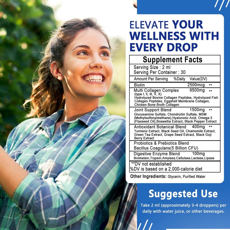 Collagen Peptides Liquid Drops, Multi Collagen Peptide for Skin Hair Nail Joints Bones Gut Health, Hydrolyzed Liquid Collagen Peptides w/Glucosamine Chondroitin MSM Biotin Vitamins for Women and Men