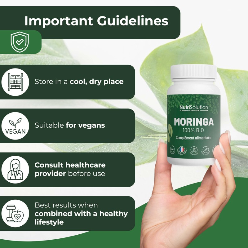 - 100% organic and vegan: our Moringa capsules are certified organic, vegetable, gluten and GMO free. They can be easily integrated into different diets. For optimal results, take 3 capsules daily with a glass of water with a meal.