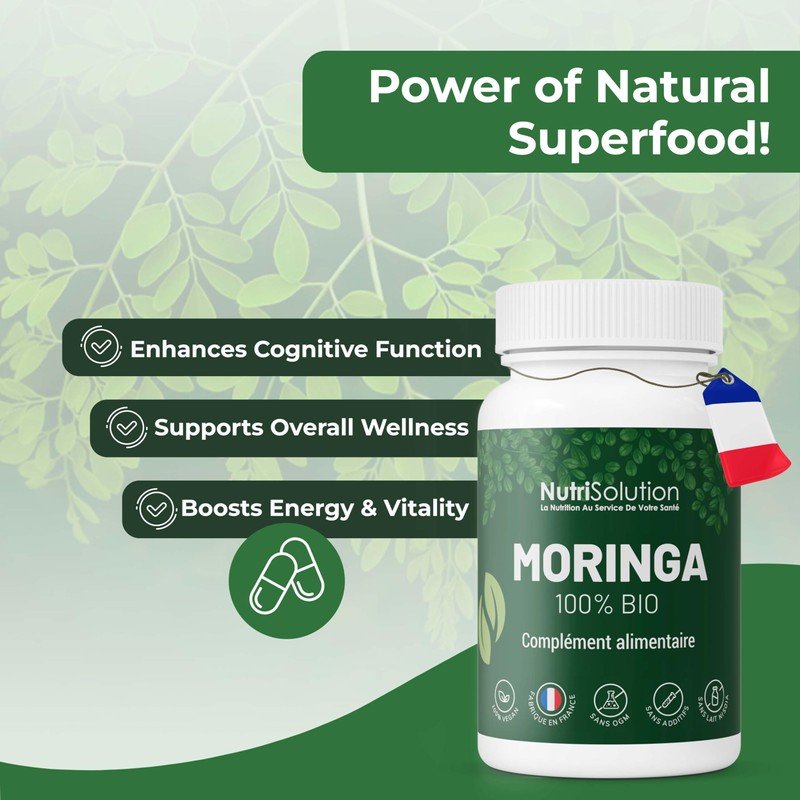 NutriSolution Moringa Capsules 100% Organic - Superfood Full of Multivitamins and Minerals - Powder from Moringa Oleifera Leaves - 90 Vegetarian Capsules - Made in France (1)