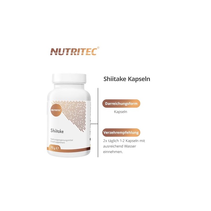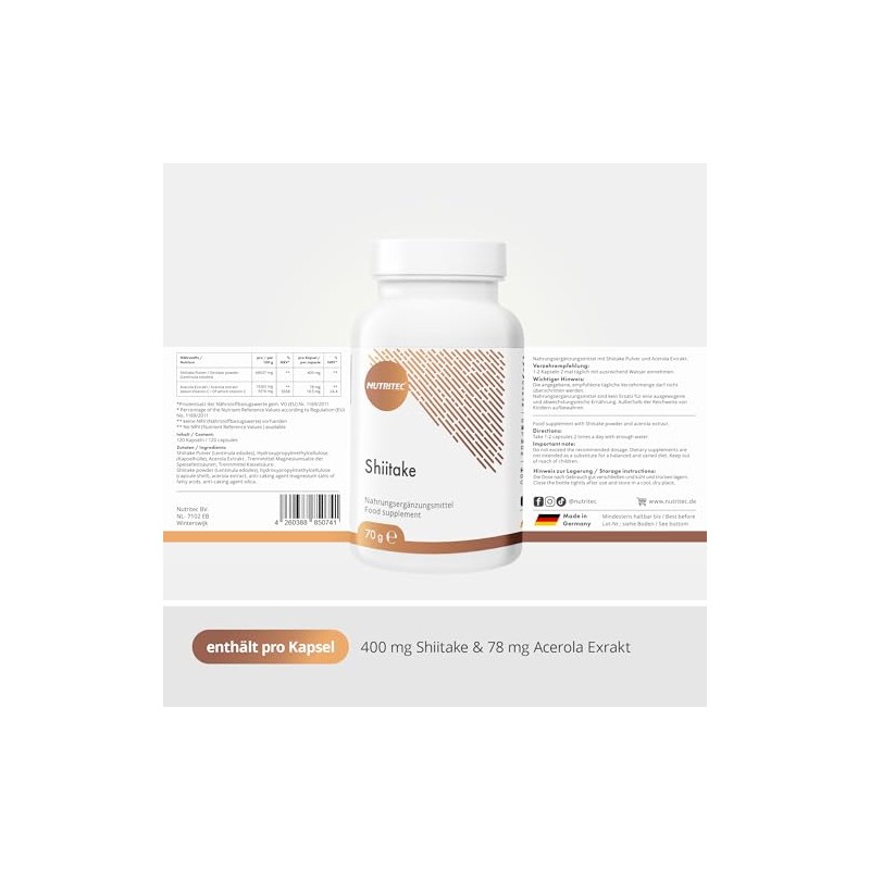 Nutritec Nutritec Shiitake medicinal mushroom 120 capsules high dosage, dietary supplement with mushroom powder and acerola extract, vegan, without additives