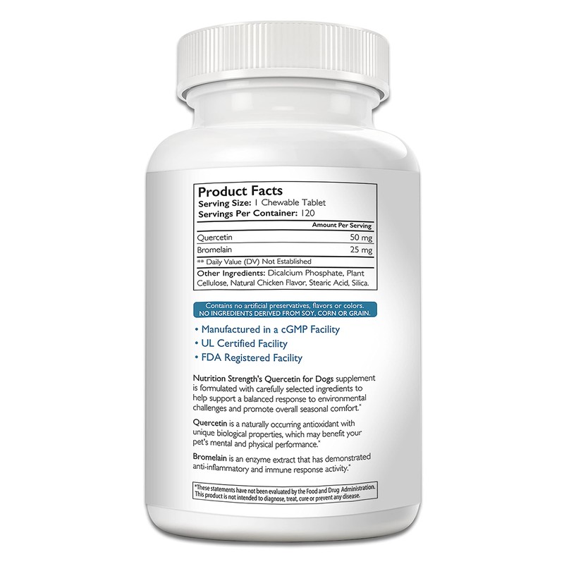 - Made in the USA: Nutrition Strength's quercetin for dogs with bromelain to support balanced immune system, promote inflammatory relief & antioxidant activity, quercetin for dog allergies is human grade; our premium quercetin and bromelain for dogs tablets meet the strictest animal supplement manufacturing guidelines, to guarantee your pet's safety, and are made with carefully selected, high quality ingredients for optimal results