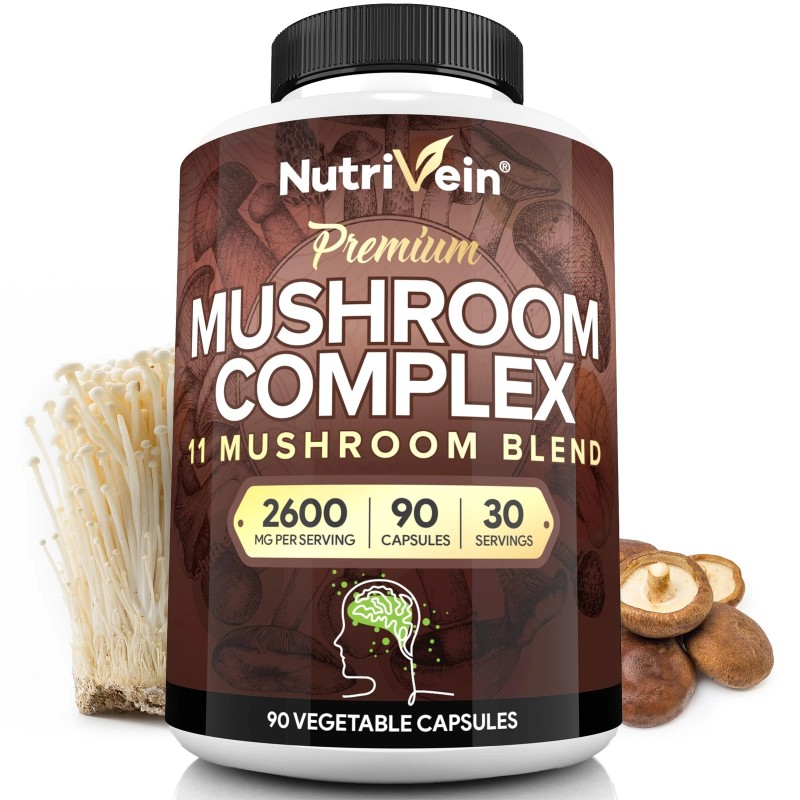 - Premium 11 Mushroom Blend – Nutrivein’s advanced formula combines 11 of nature’s most studied and sought-after mushrooms. Lion’s Mane, Chaga, Reishi, Turkey Tail, Maitaike, Shiitake, Cordyceps Sinensis, Agaricus, Enoki, White Button and Oyster.